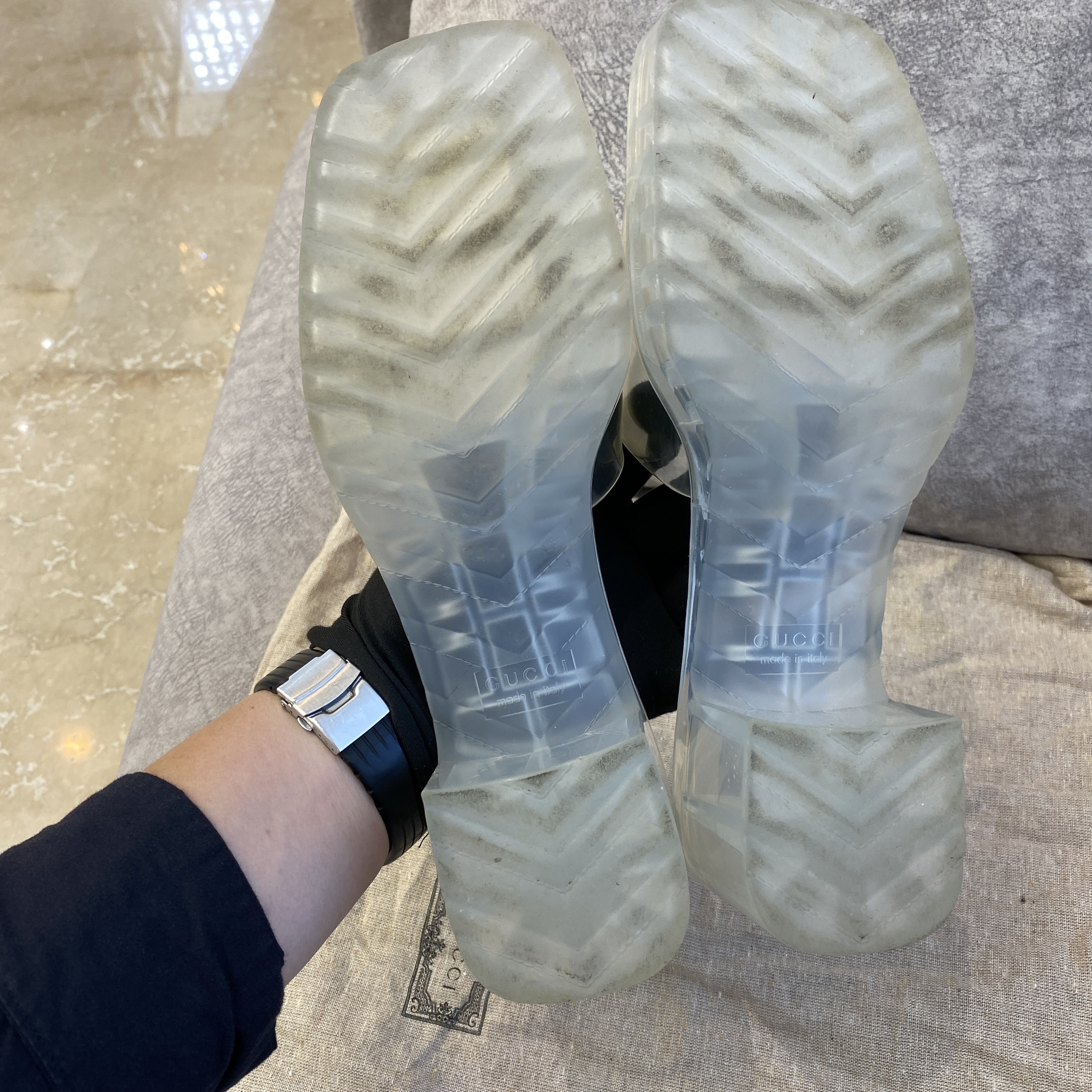 PREOWNED GUCCI TRANSPARENT PVC LOGO SLIDE SANDALS (SIZE 39)