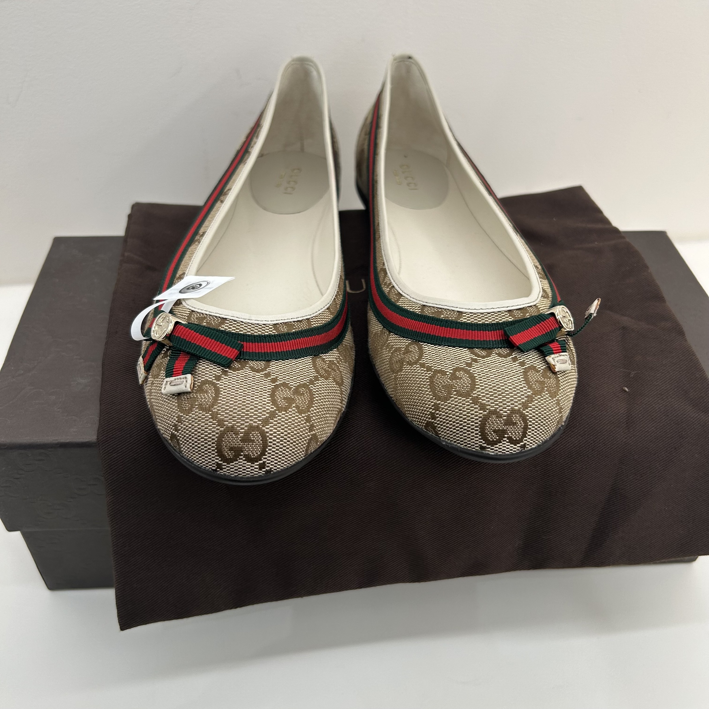 PREOWNED GUCCI BROWN/BEIGE GG CANVAS MAYFAIR BOW BALLET FLATS (SIZE 37 1/2)